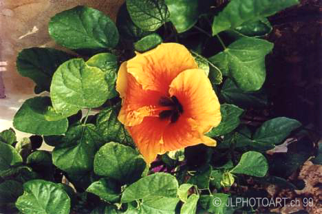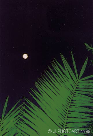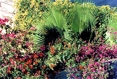 Blumen, Palmen und Kakteen verwachsen.
